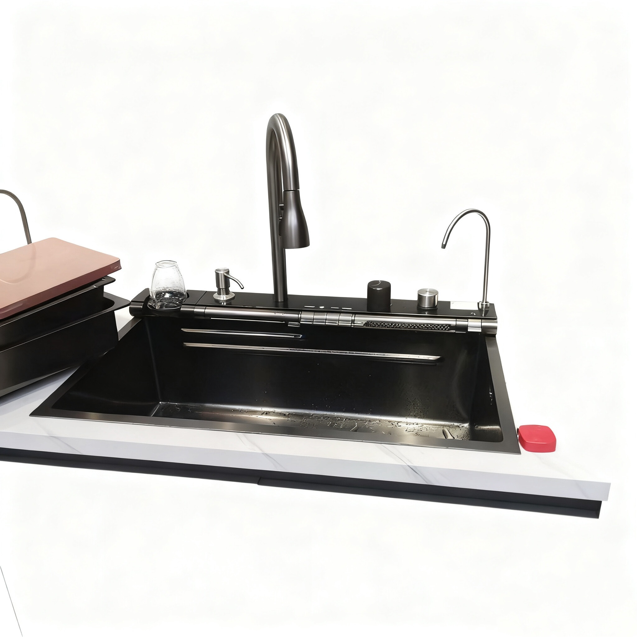 Ο σχεδιασμός του υψηλού τόξου όχι μόνο προσθέτει μια κομψή πινελιά στην διακόσμηση της κουζίνας αλλά προσφέρει επίσης ανώτερη λειτουργικότητα.Επιτρέπει την εύκολη γέμιση ψηλών δοχείων και παρέχει γενναιόδωρο κενό για να ελιγμίζονται τα πιάτα κάτω από το ρεύμα νερούΗ βρύση είναι σχεδιασμένη για ομαλή λειτουργία, με ακριβή έλεγχο της ροής και της θερμοκρασίας του νερού, βελτιώνοντας τη συνολική ευκολία και την αποτελεσματικότητα της εμπειρίας του νεροχύτη της κουζίνας σας.Είτε είσαι επαγγελματίας σεφ είτε μαγείρισσα στο σπίτι, αυτό το νεροχύτη από ανοξείδωτο χάλυβα με μεγάλη τόξο βρύση συνδυάζει πρακτικότητα και αισθητική για να καλύψει όλες τις ανάγκες της κουζίνας σας.